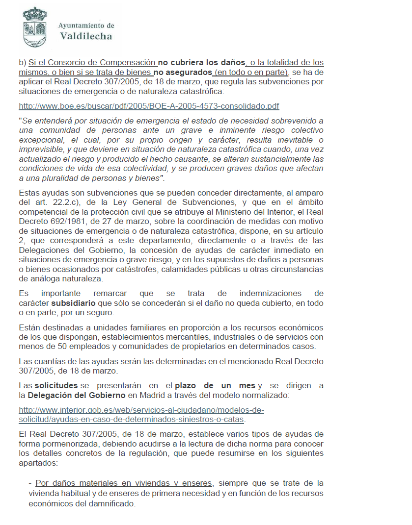 b) Si el Consorcio de Compensación no cubriera los daños, o la totalidad de los mismos, o bien si se trata de bienes no asegurados (en todo o en parte), se ha de aplicar el Real Decreto 307/2005, de 18 de marzo, que regula las subvenciones por situaciones de emergencia o de naturaleza catastrófica: