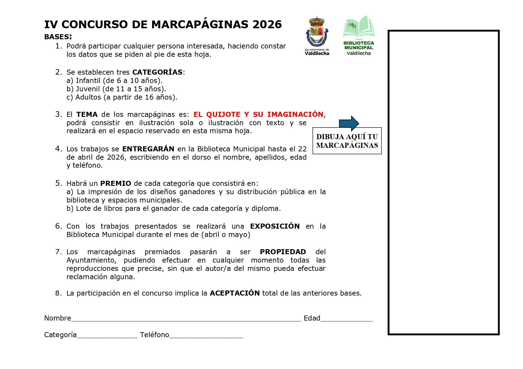 Con la llegada del mes de abril, la Biblioteca Municipal de Valdilecha pone en marcha, un año más, el Concurso de Marcapáginas, una iniciativa que busca fomentar la lectura y dar visibilidad al talento creativo de nuestro municipio.